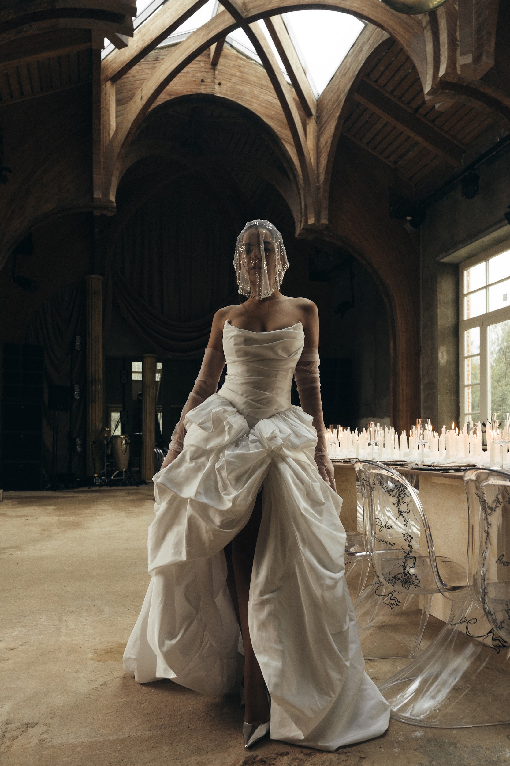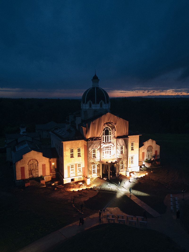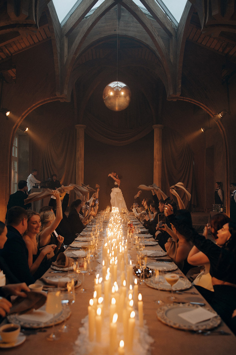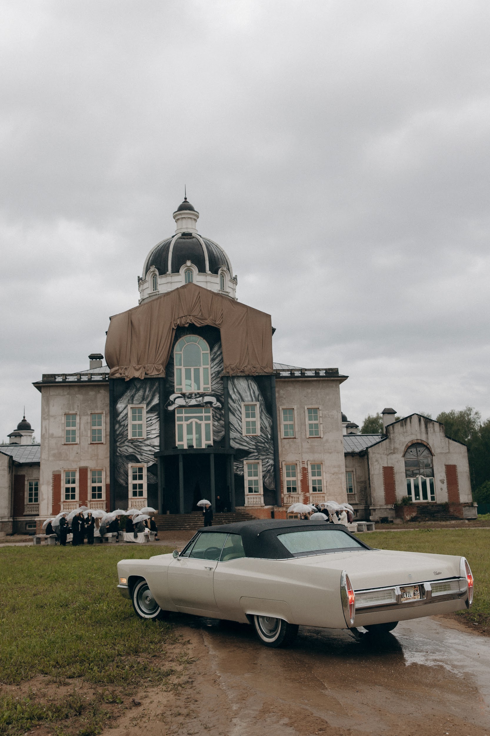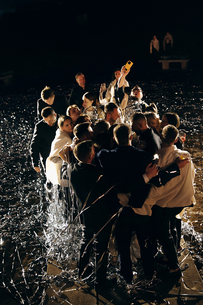 Свадьба проходила в недостроенном крыле Виллы Микетти — пространстве с особой атмосферой. Строгая архитектура и приглушённая эстетика вдохновили нас на создание торта, который продолжил бы эту линию. Мы выбрали глубокий графитовый оттенок и минималистичную прямоугольную форму — словно фрагмент современной скульптуры.